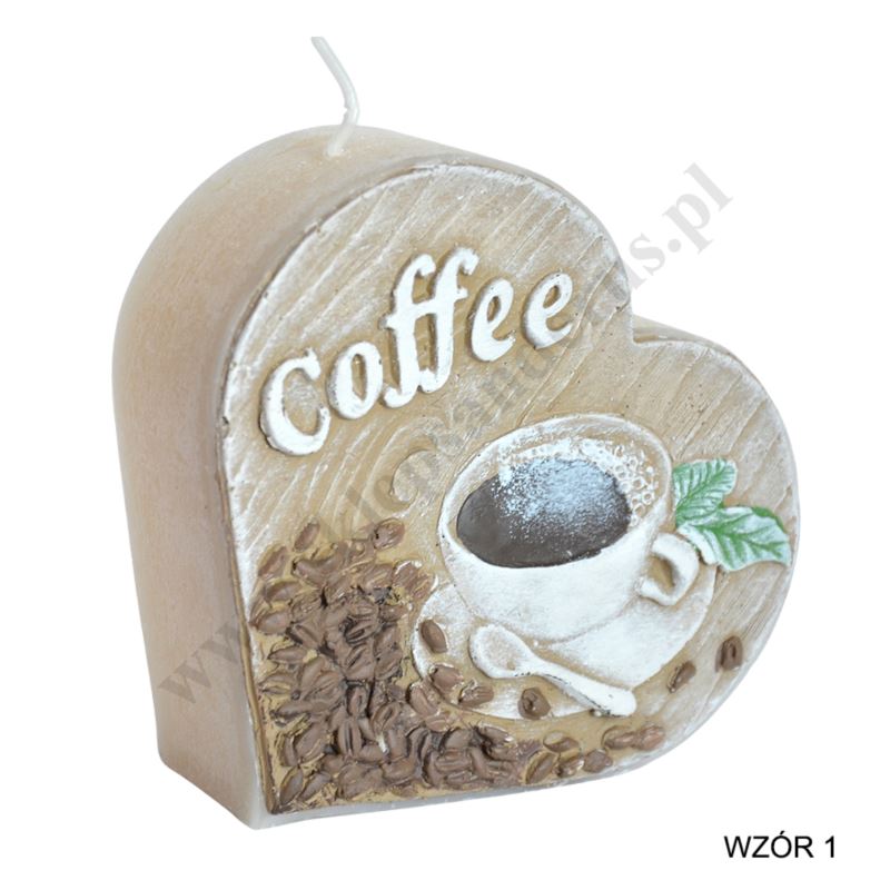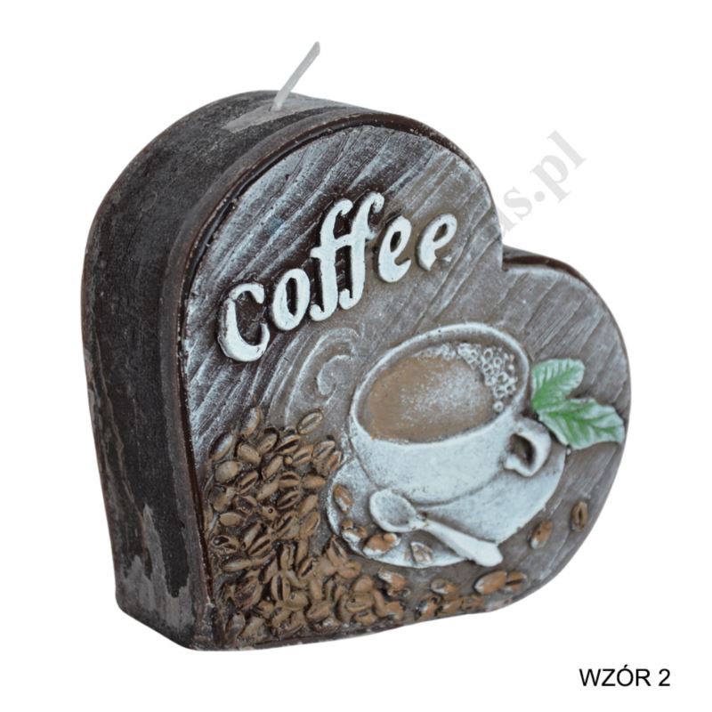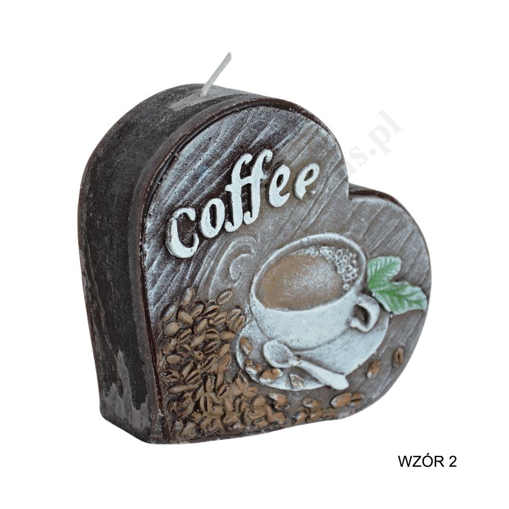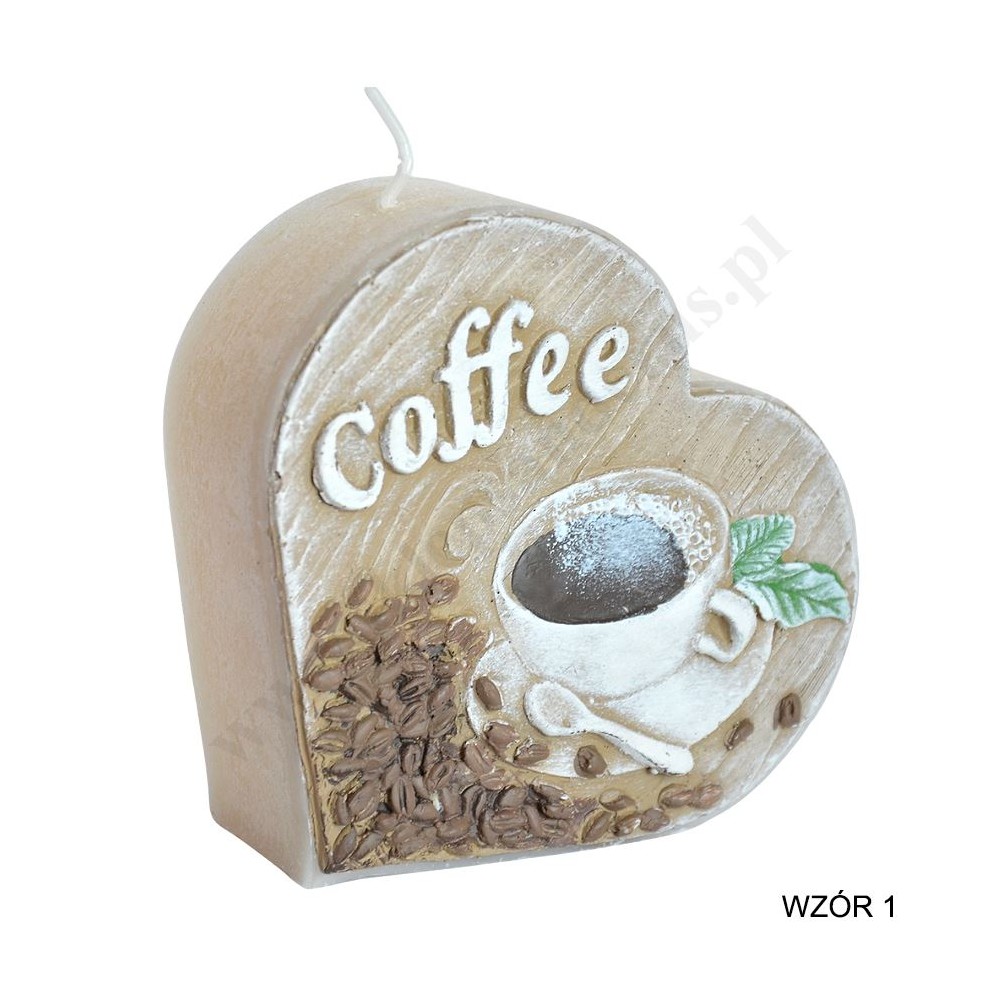 Świeca zapachowa w kształcie serca o wysokości 10 cm i szerokości 10.6 cm. Sprzedaż w miksie wzorów.