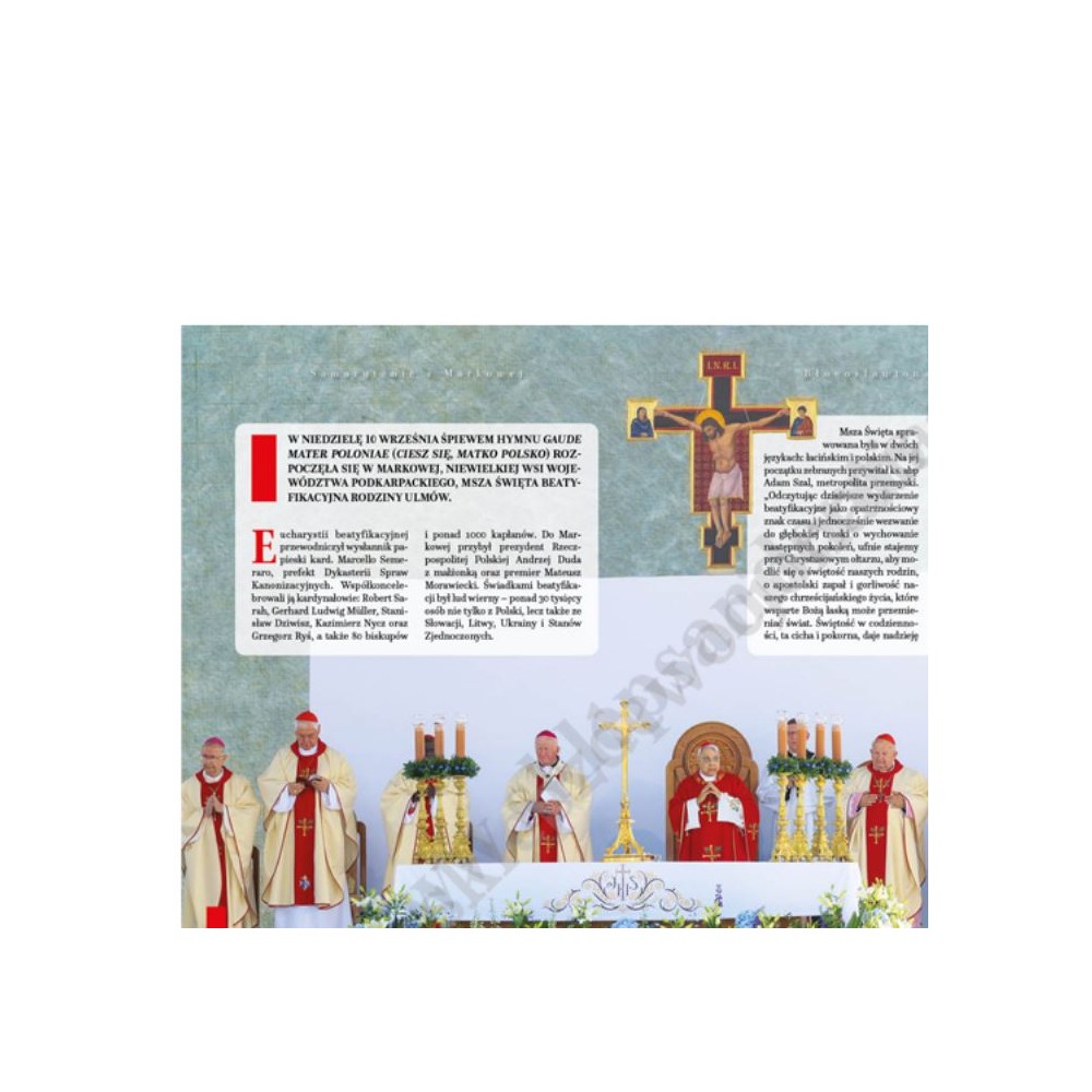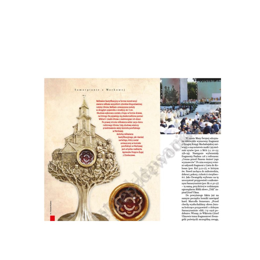 Publikacja upamiętniająca jedno z najpiękniejszych wydarzeń ostatnich lat – uroczystość beatyfikacji rodziny Ulmów. Absolutnie wyjątkowy album przygotowany został przez ks. Pawła Tołpę wraz z markowianami, członkami rodziny Ulmów, świadkami pamiętającymi Józefa, Wiktorię i ich dzieci. Dzięki temu udało się stworzyć nie tylko dzieło o bezcennej wartości merytorycznej, z mnóstwem niepublikowanych dotąd informacji i fotografii (wiele z nich na potrzeby tego opracowania zostało poddane obróbce cyfrowej i koloryzacji), ale także o wyjątkowych walorach emocjonalnych. Można powiedzieć, że to książka bez precedensu, bo stworzona przez markowską społeczność w hołdzie i ku pamięci swych bohaterskich rodaków z okazji wyjątkowego wydarzenia, jakim jest ich beatyfikacja.