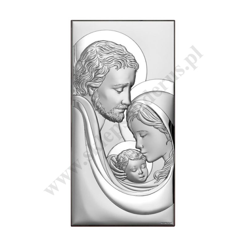 Srebrny obrazek przedstawiający wizerunek Świętej Rodziny. Rozmiar obrazka 4.5 x 9 cm. PONIŻEJ W PRODUKTACH POWIĄZANYCH ISTNIEJE MOŻLIWOŚĆ ZAMÓWIENIA OKAZJONALNEJ DEDYKACJI NA TABLICZCE LUB REWERSIE OBRAZKA.