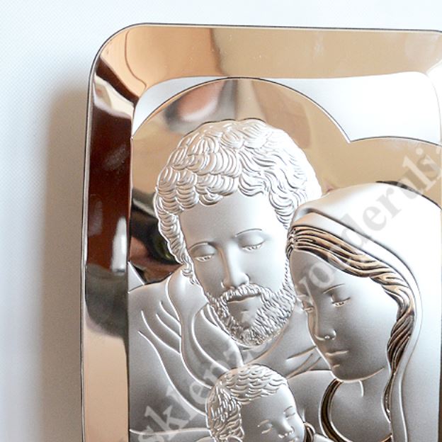 Srebrny obrazek przedstawiający wizerunek Świętej Rodziny wykonany z metalu dwuwarstwowego, aluminium i srebra. Zewnętrzna warstwa srebra o próbie 925 została pokryta dla zabezpieczenia warstwą lakieru. Rewers obrazka wykonany jest z eleganckiego drewna najwyższej jakości. Obrazek można powiesić na ścianie lub postawić na półce. Obrazek zapakowany jest w eleganckie kartonowe pudełko.