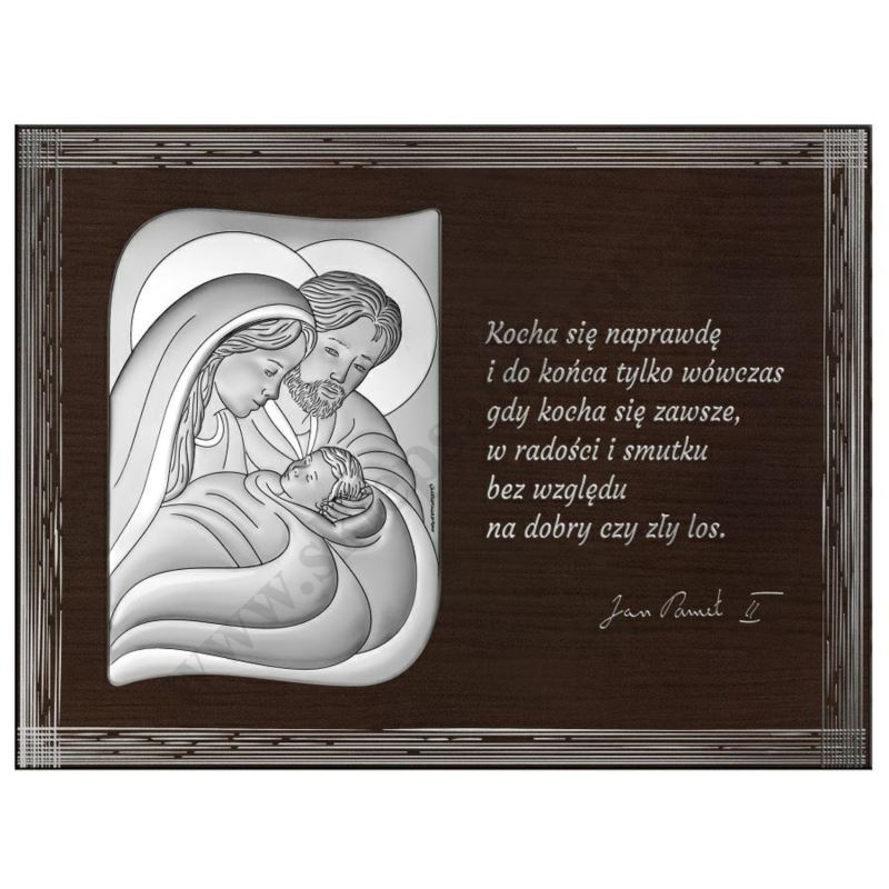 Srebrny obrazek przedstawiający wizerunek Świętej Rodziny, umieszczony na eleganckiej drewnianej płytce z tekstem słów Świętego Jana Pawła II. Rozmiar obrazka 24.5 x 18 cm.