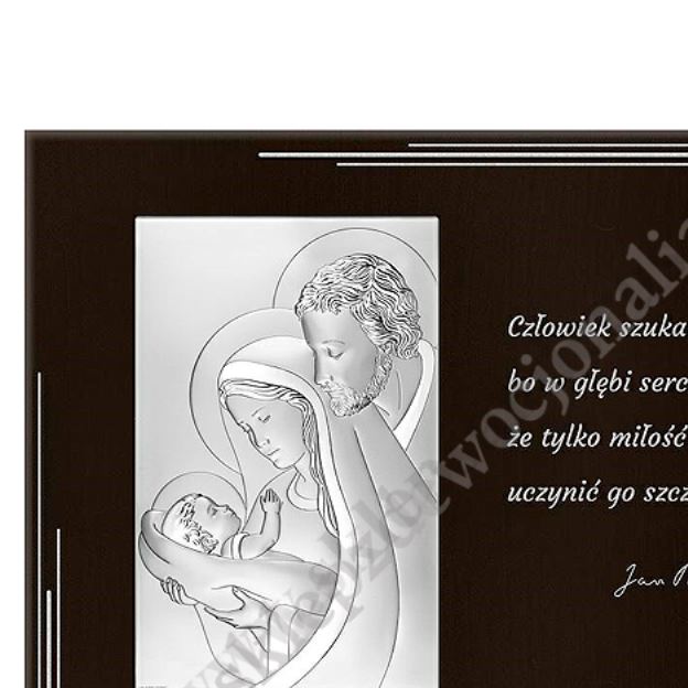 Srebrny obrazek przedstawiający Świętą Rodzinę. Rozmiar obrazka 20 x 15 cm. PONIŻEJ W PRODUKTACH POWIĄZANYCH ISTNIEJE MOŻLIWOŚĆ ZAMÓWIENIA OKAZJONALNEJ DEDYKACJI NA TABLICZCE LUB REWERSIE OBRAZKA.