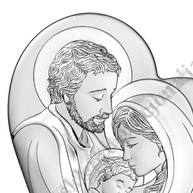 Srebrny obrazek w kształcie serca przedstawiający wizerunek Świętej Rodziny. Rozmiar obrazka 18 x 16 cm. PONIŻEJ W PRODUKTACH POWIĄZANYCH ISTNIEJE MOŻLIWOŚĆ ZAMÓWIENIA OKAZJONALNEJ DEDYKACJI NA TABLICZCE LUB REWERSIE OBRAZKA.