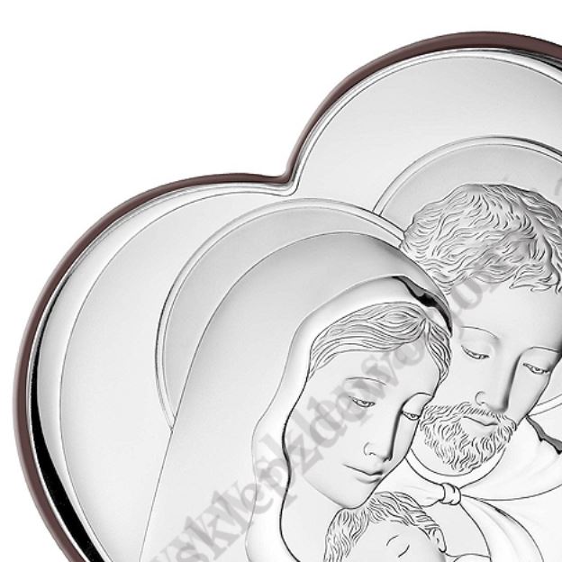 Srebrny obrazek w kształcie serca przedstawiający wizerunek Świętej Rodziny. Rozmiar obrazka 10.5 x 9 cm. PONIŻEJ W PRODUKTACH POWIĄZANYCH ISTNIEJE MOŻLIWOŚĆ ZAMÓWIENIA OKAZJONALNEJ DEDYKACJI NA TABLICZCE LUB REWERSIE OBRAZKA.