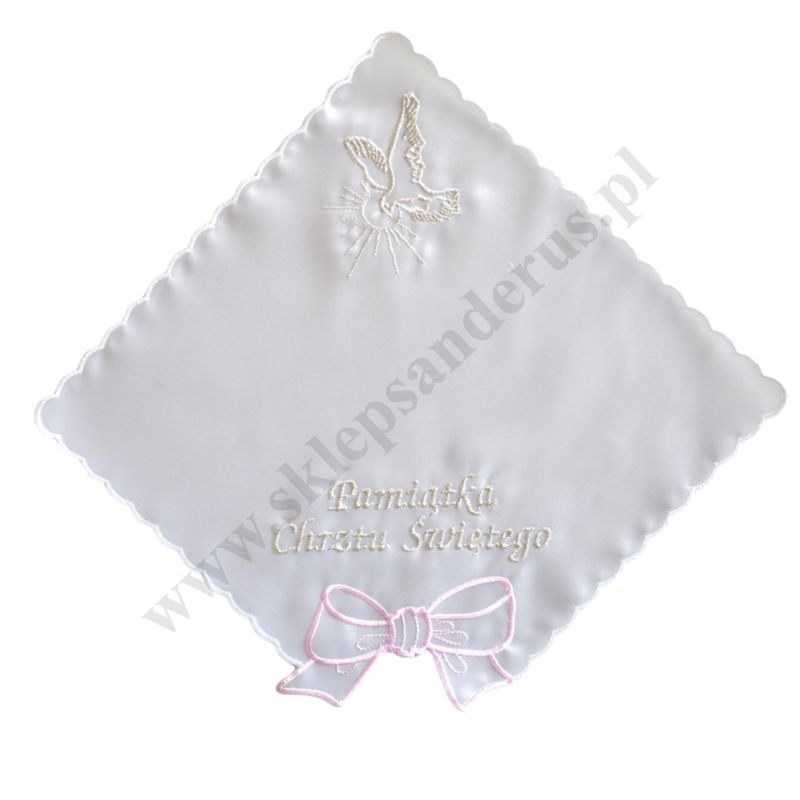 Szatka do chrztu w kształcie kwadratu z motywem kokardki w jednym z rogów. Szerokość szatki 24 cm, wysokość szatki 24 cm.