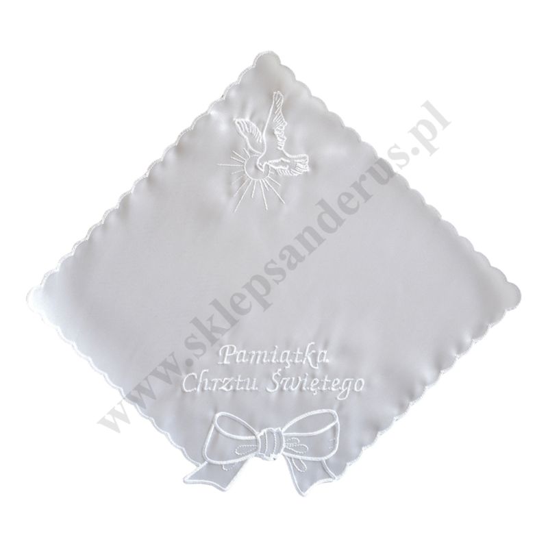 Szatka do chrztu w kształcie kwadratu z motywem kokardki w jednym z rogów. Szerokość szatki 24 cm, wysokość szatki 24 cm.