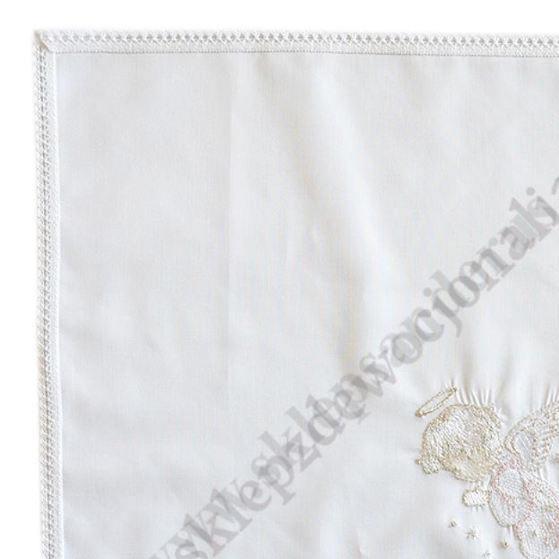 Szatka do chrztu w kształcie kwadratu z wyhaftowanym motywem chrzcielnym. Szerokość szatki 30 cm, wysokość szatki 30 cm. Materiał: bawełna.