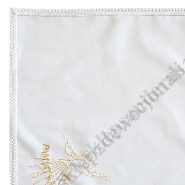 Szatka do chrztu w kształcie kwadratu z wyhaftowanym motywem chrzcielnym. Szerokość szatki 30 cm, wysokość szatki 30 cm. Materiał: bawełna.
