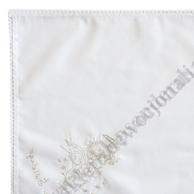 Szatka do chrztu w kształcie kwadratu z wyhaftowanym motywem chrzcielnym. Szerokość szatki 30 cm, wysokość szatki 30 cm. Materiał: bawełna.
