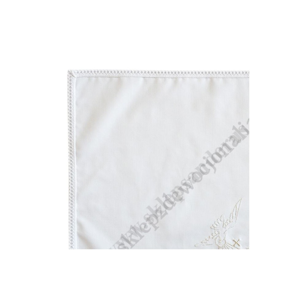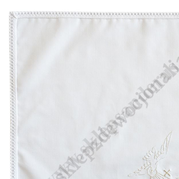 Szatka do chrztu w kształcie kwadratu z wyhaftowanym motywem chrzcielnym. Szerokość szatki 30 cm, wysokość szatki 30 cm. Materiał: bawełna.