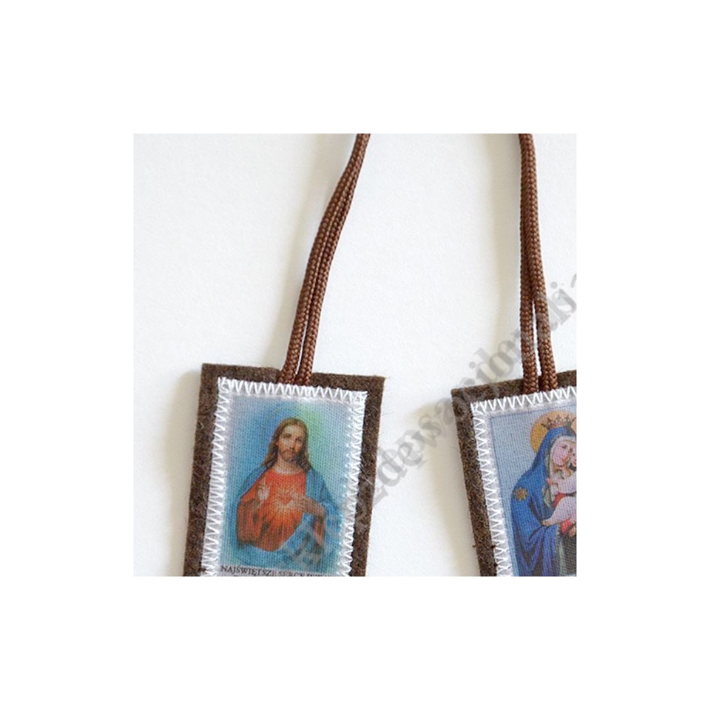 Szkaplerz karmelitański wykonany z tkaniny płaszczowej o wymiarach 3 x 4 cm, długość tasiemki ok.46 cm.