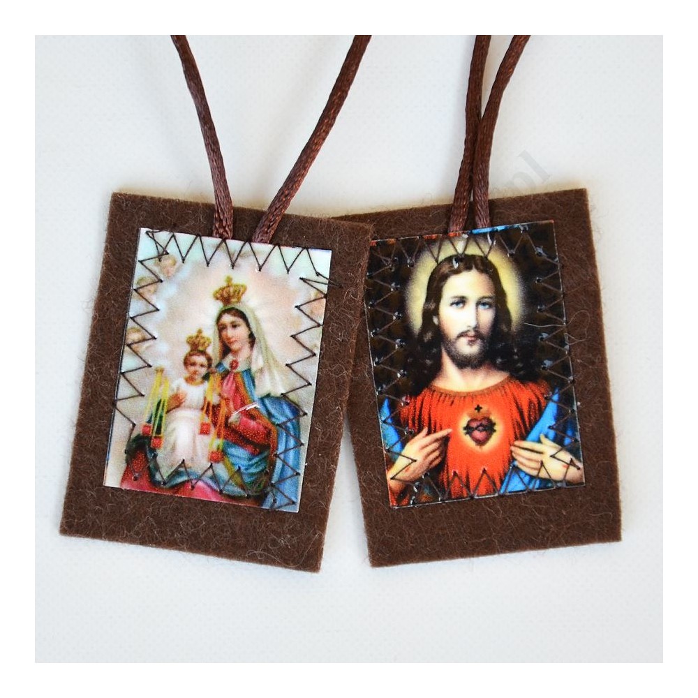 Szkaplerz z wizerunkiem Serca Pana Jezusa i Matki Bożej Szkaplerznej wykonany z tkaniny płaszczowej o wymiarach 4 x 5 cm, długość tasiemki ok.40 cm.