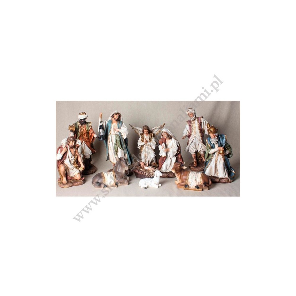 Figury do szopki bożonarodzeniowej o wysokości najwyższej figurki 33 cm. W eleganckiej pastelowej kolorystyce ze złotymi zdobieniami. Zestaw składający się z 11 elementów. Figurki wykonane z masy żywicznej.