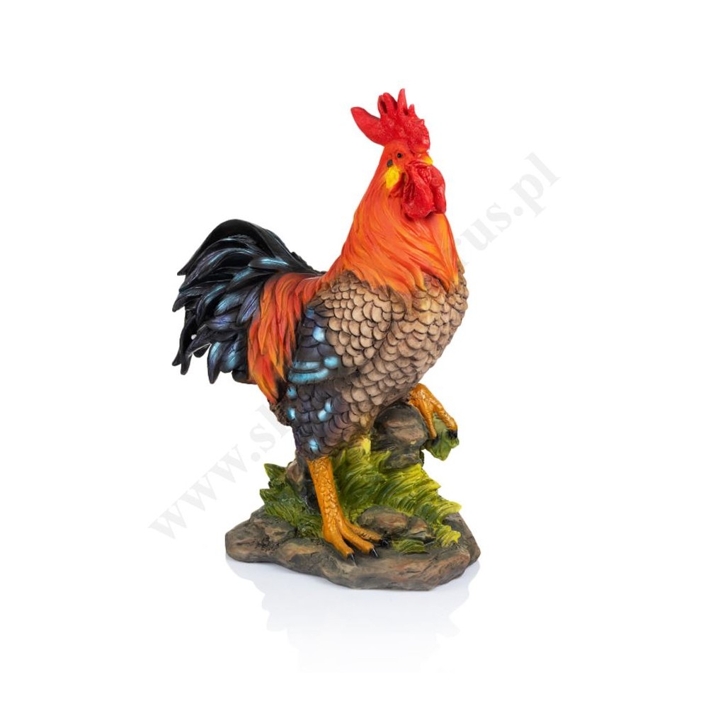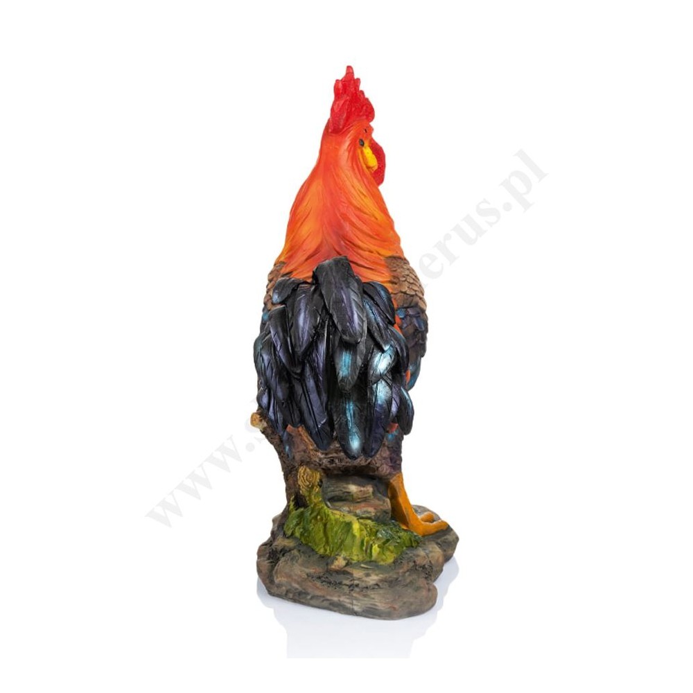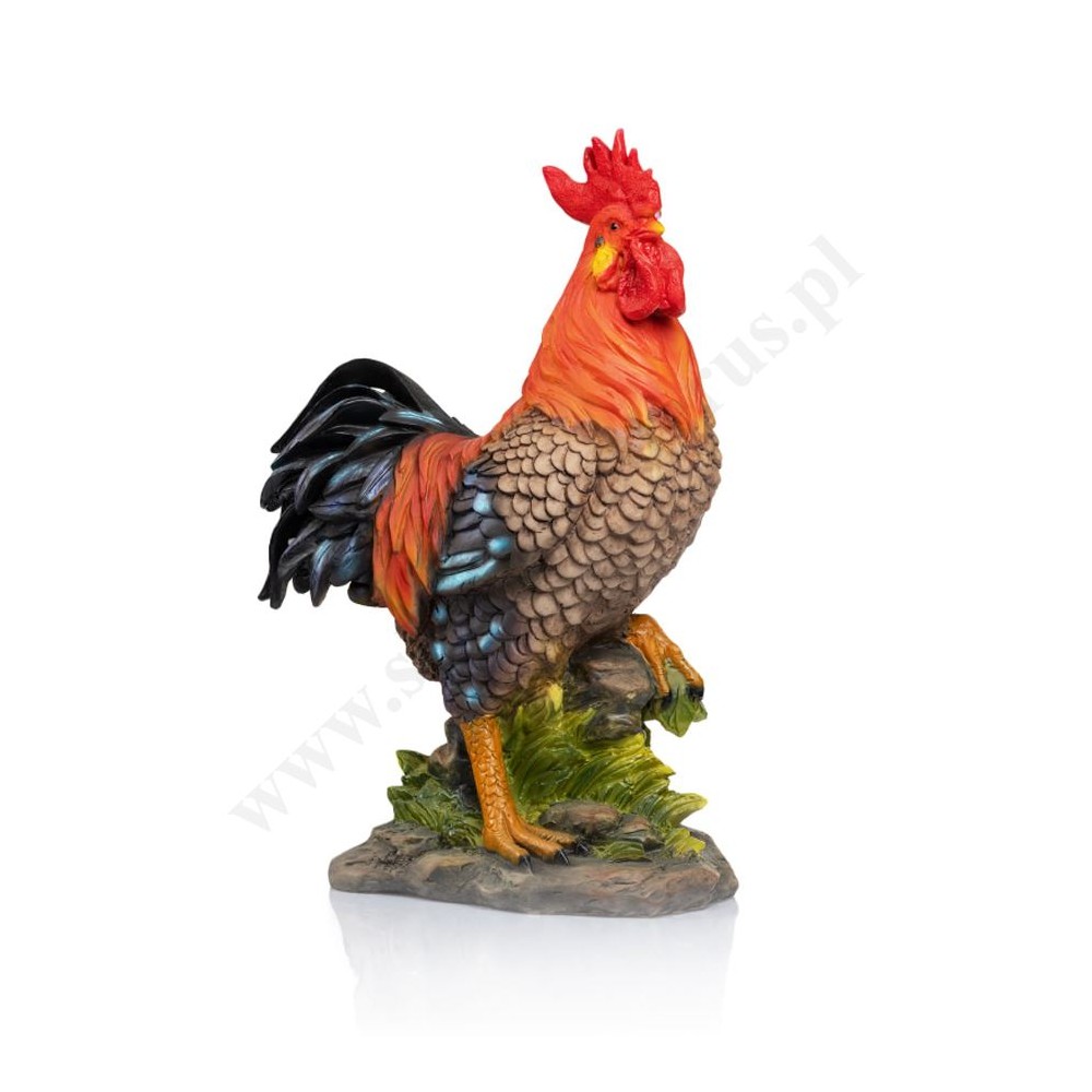 Figurka koguta do szopki bożonarodzeniowej o wysokości 41.5 cm, szerokości 28 cm i głębokości 17 cm wykonana z żywicy.