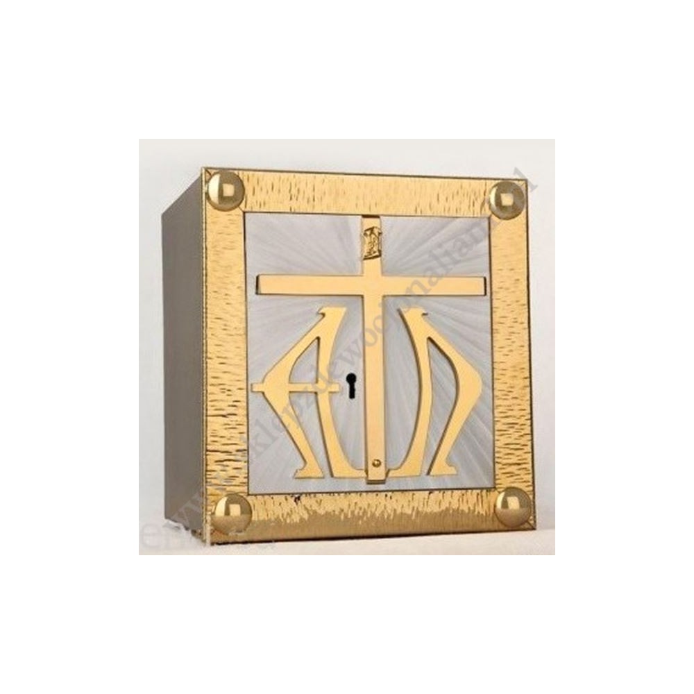 Tabernakulum o wymiarach zewnętrznych: wysokość 40 cm, szerokość 40 cm, głębokość 38 cm.
