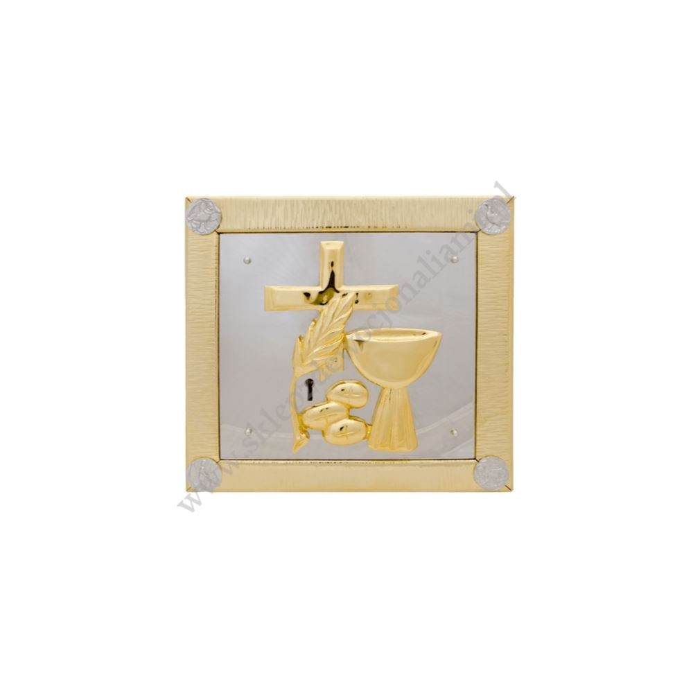 Front tabernakulum wykonany jest z mosiądzu, niklowany i złocony. Wnętrze wykonane jest z blachy nierdzewnej lub blachy mosiężnej lakierowanej.