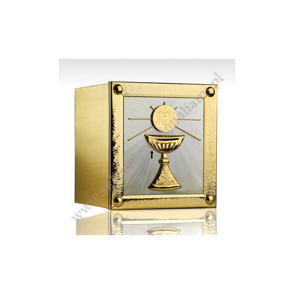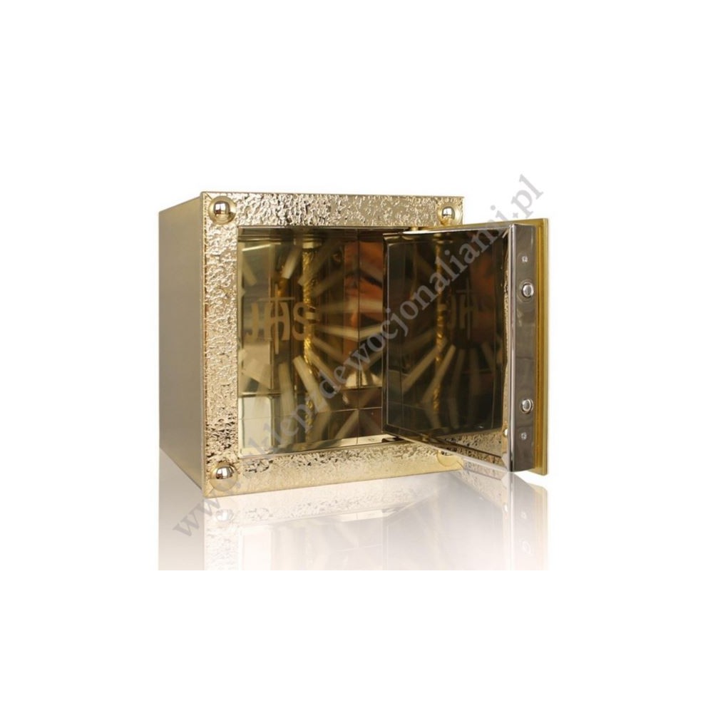 Tabernakulum o wymiarach zewnętrznych: wysokość 27 cm, szerokość 25.5 cm, głębokość 22 cm.