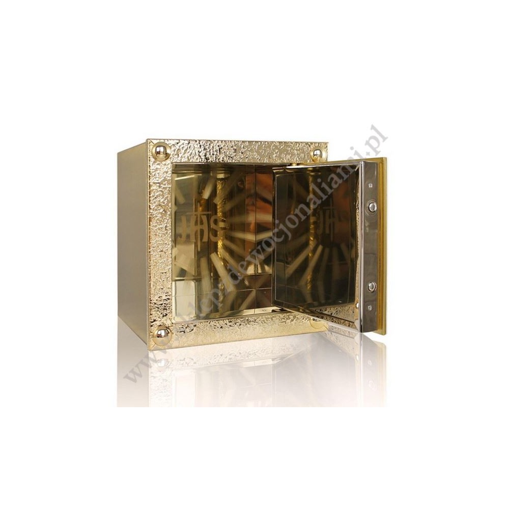 Tabernakulum o wymiarach zewnętrznych: wysokość 27 cm, szerokość 25.5 cm, głębokość 22 cm.