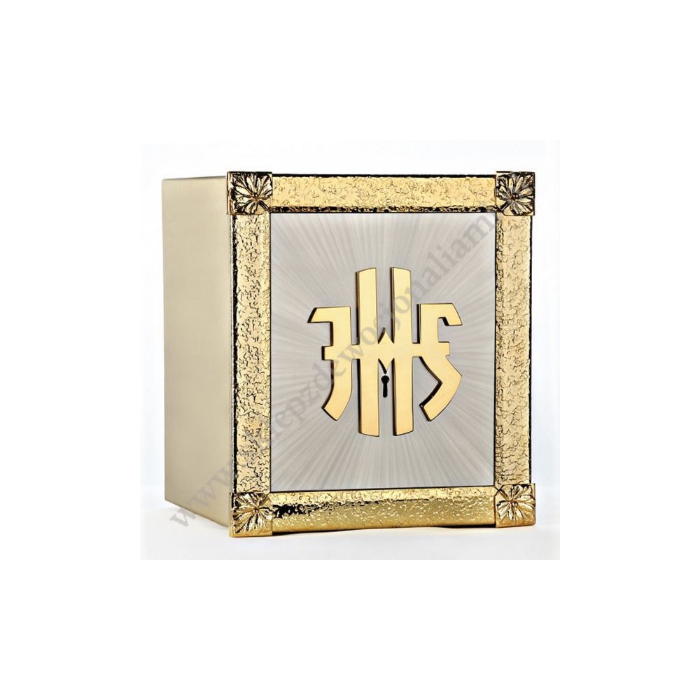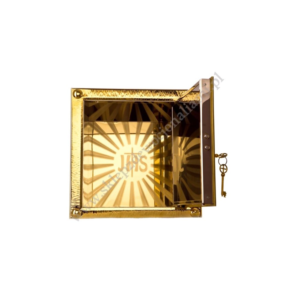 Tabernakulum o wymiarach zewnętrznych: wysokość 27 cm, szerokość 25.5 cm, głębokość 22 cm.