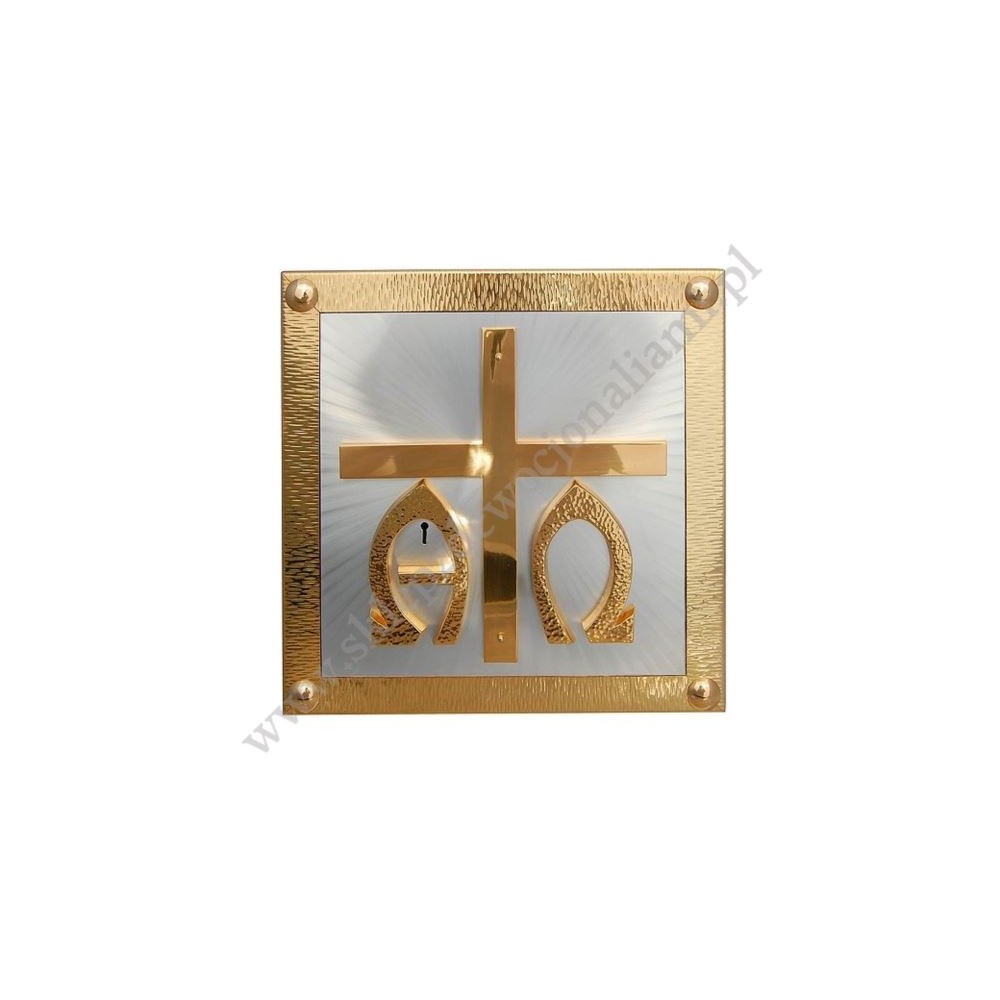 Tabernakulum o wymiarach zewnętrznych: wysokość 27 cm, szerokość 25.5 cm, głębokość 22 cm.