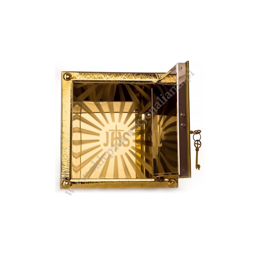 Tabernakulum o wymiarach zewnętrznych: wysokość 30 cm, szerokość 33 cm, głębokość 28 cm.