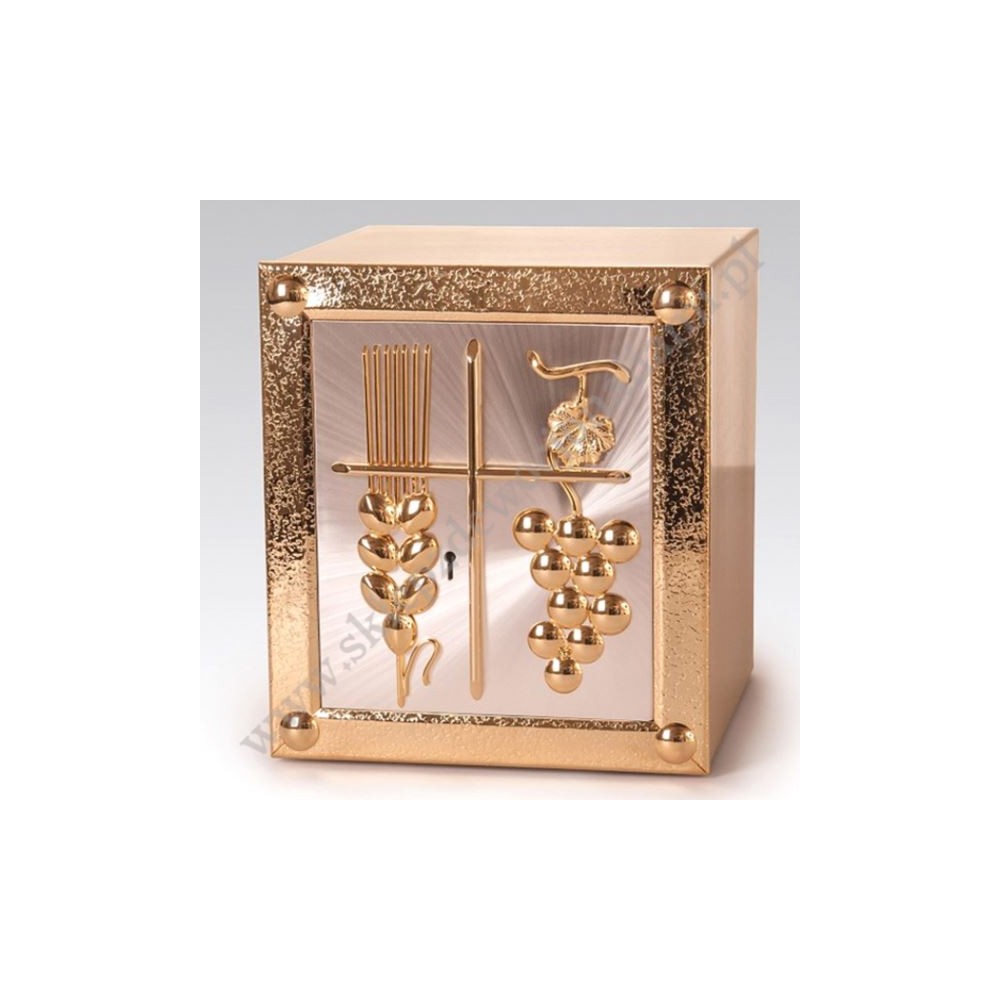 Tabernakulum o wymiarach zewnętrznych: wysokość 30 cm, szerokość 33 cm, głębokość 28 cm.