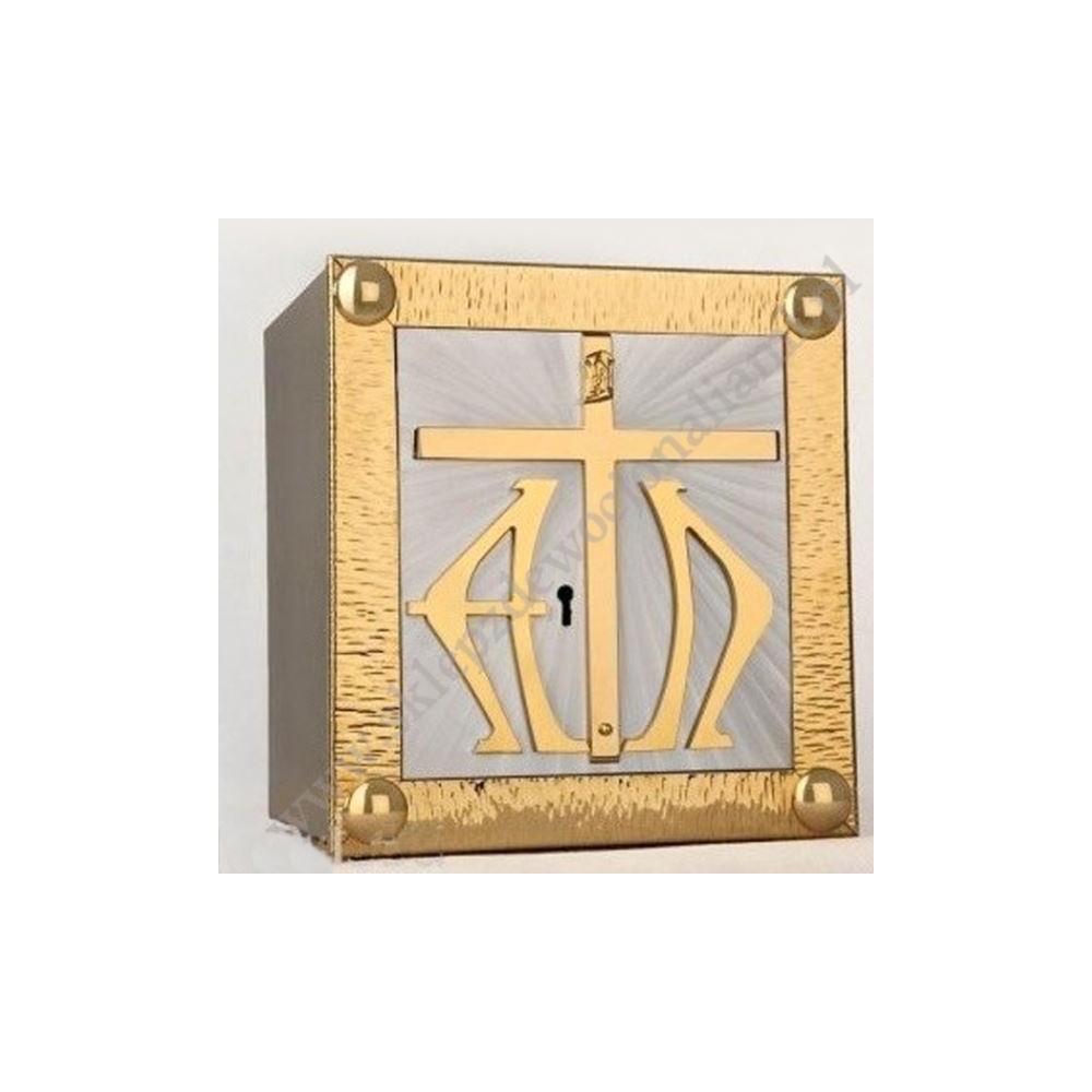 Tabernakulum o wymiarach zewnętrznych: wysokość 30 cm, szerokość 33 cm, głębokość 28 cm.