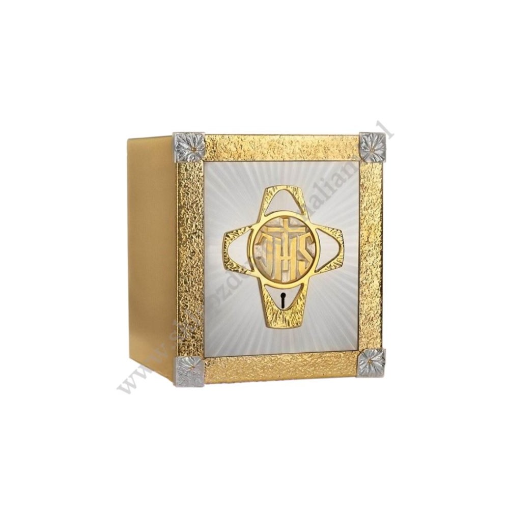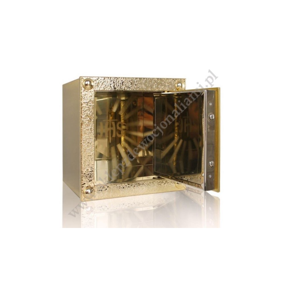 Tabernakulum o wymiarach zewnętrznych: wysokość 40 cm, szerokość 40 cm, głębokość 38 cm.