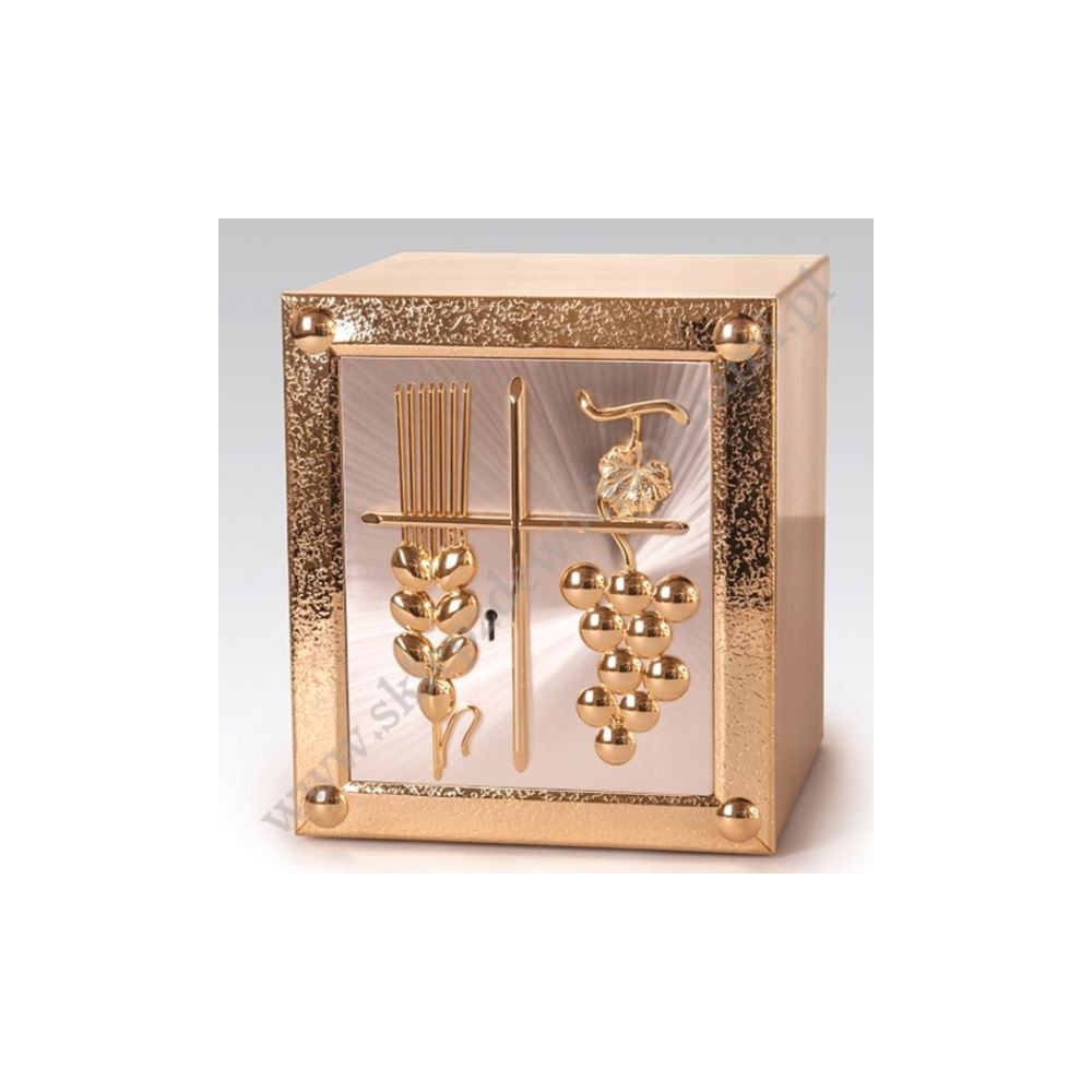 Tabernakulum o wymiarach zewnętrznych: wysokość 40 cm, szerokość 40 cm, głębokość 38 cm.