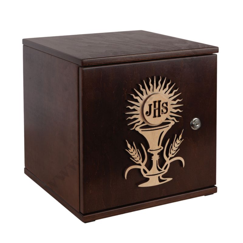 Tabernakulum wykonane zostało z najwyższą starannością z myślą o czci należnej Najświętszemu Sakramentowi. Doskonale wpisuje się w aranżację ciemnicy podczas Triduum Paschalnego oraz jako najważniejszy element różnych wnętrz sakralnych. Naturalna sklejka sprawia, że jest lekkie i estetyczne. Na froncie znajduje się ozdobny ornament. Tabernakulum wyposażone jest w zamek.