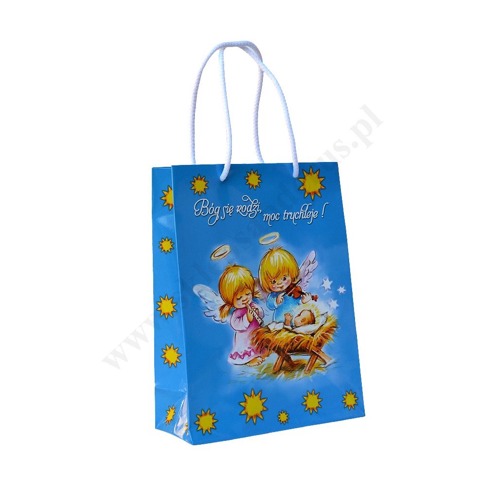 Torebka prezentowa lakierowana z aniołkami przy żłóbku w formacie 18 x 20 cm.