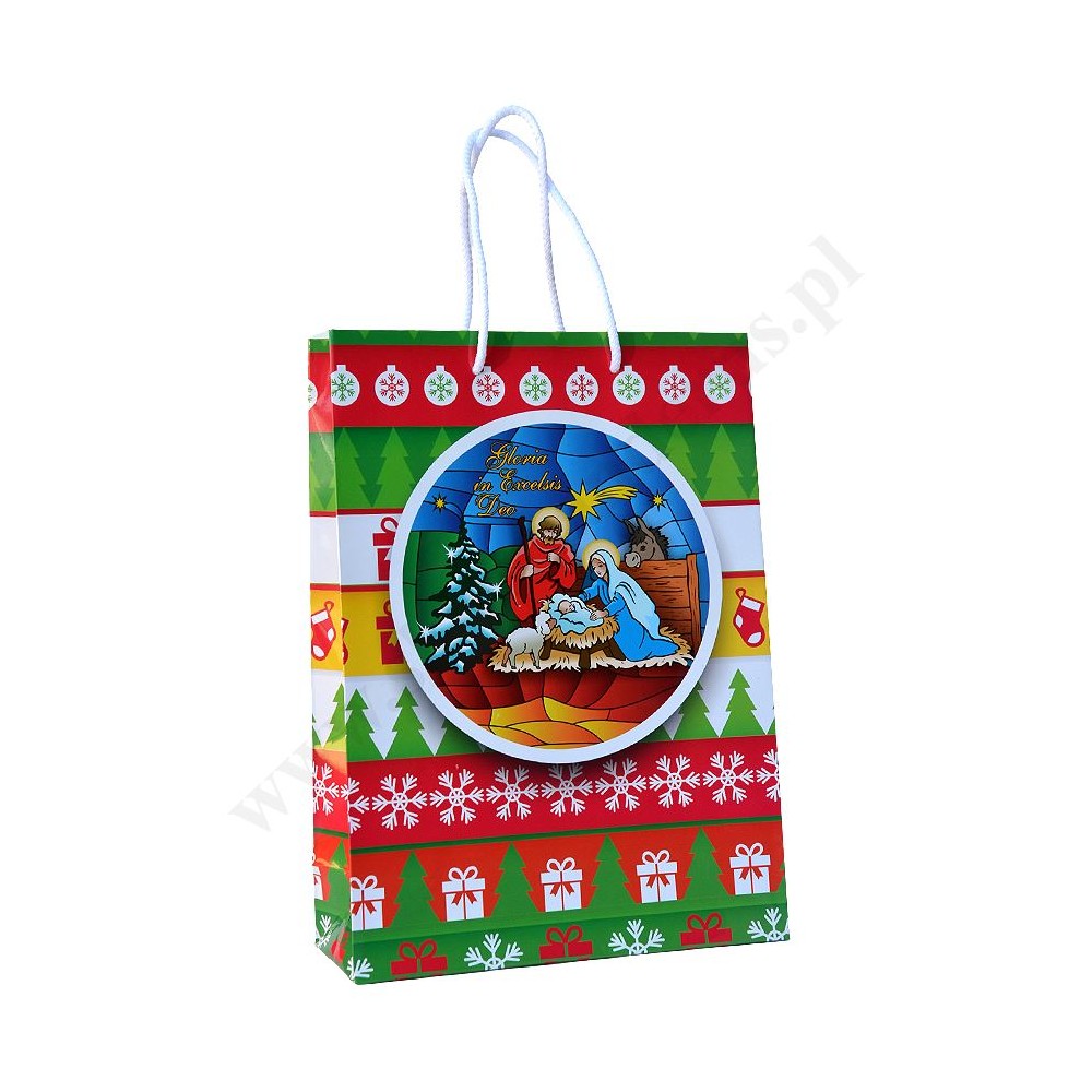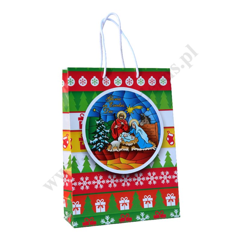 Torebka prezentowa lakierowana z motywem Świętej Rodziny z dziećmi w formacie 24 x 29 cm.