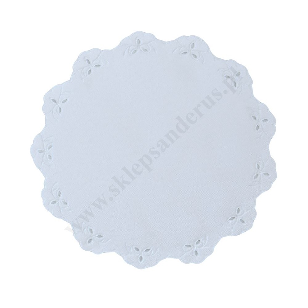 Biała serwetka o średnicy 27 cm z delikantym zdobieniem po obwodzie. Materiał poliester.