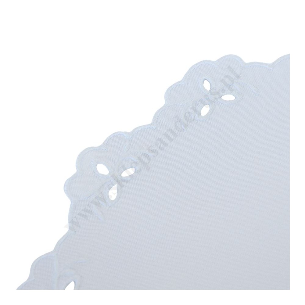 Biała serwetka o średnicy 33 cm z delikantym zdobieniem po obwodzie. Materiał poliester.