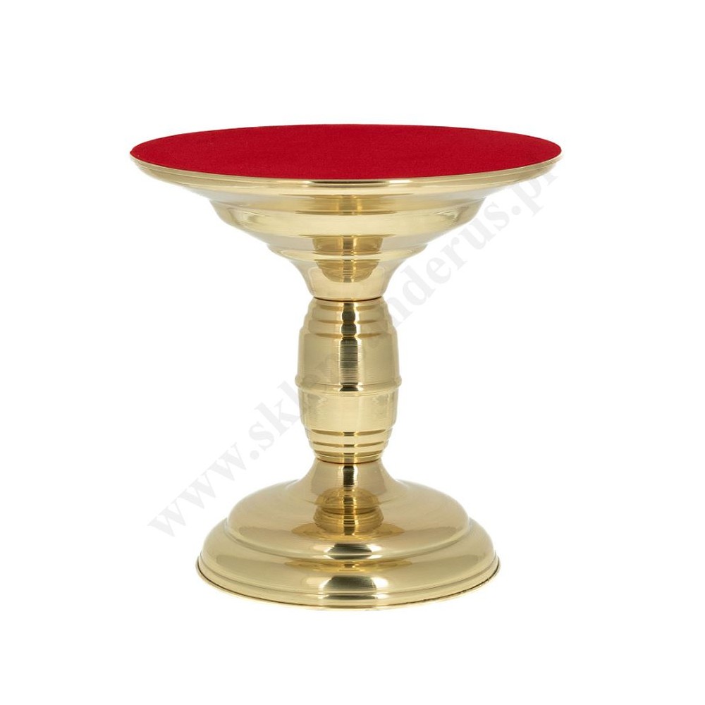 Podstawa pod monstrancję wykonana z polerowanego na wysoki połysk mosiądzu i zabezpieczona specjalnym werniksem. Wysokość podstawy 24 cm, średnica podstawy 17 cm, średnica u góry 24 cm. Góra tronu oklejona ozdobnym czerwonym suknem.