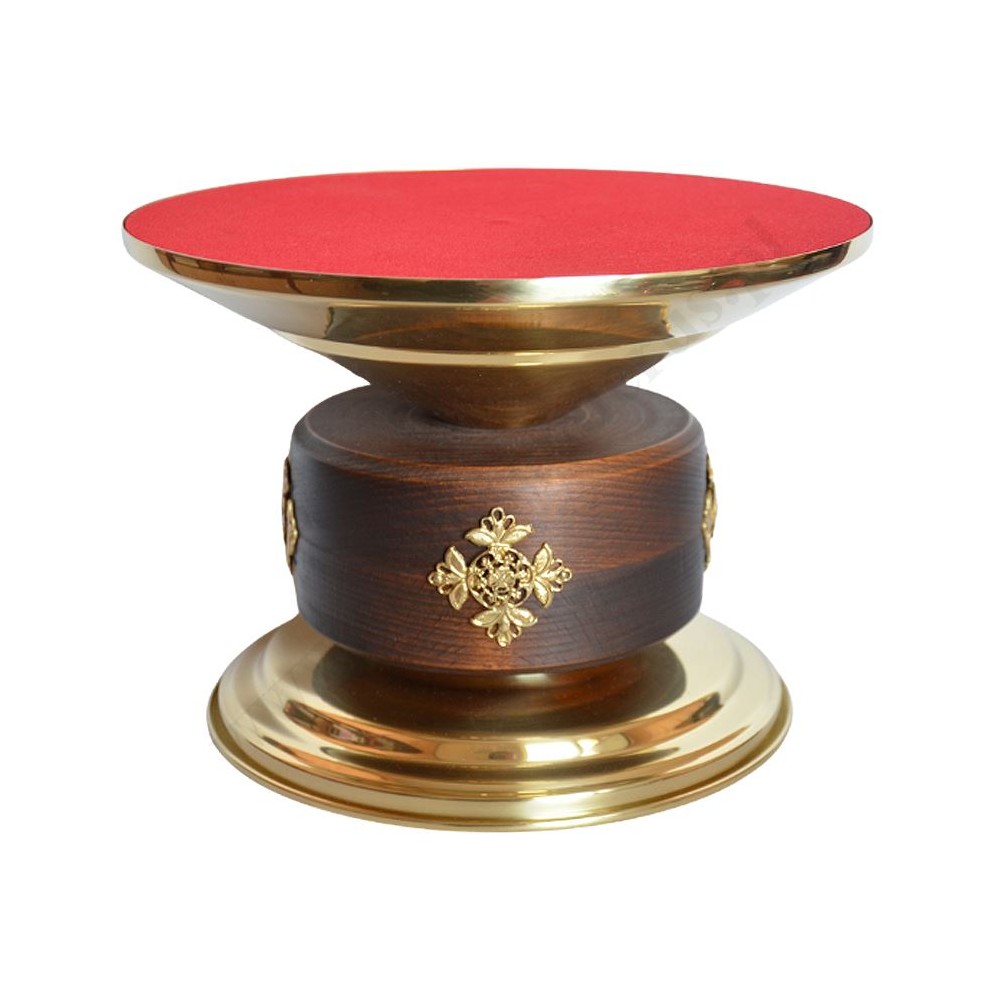 Tron pod monstrancję z drewnianym bejcowanym rdzeniem o wysokości 17.3 cm, średnica tronu 24 cm, średnica podstawy 20.5 cm.