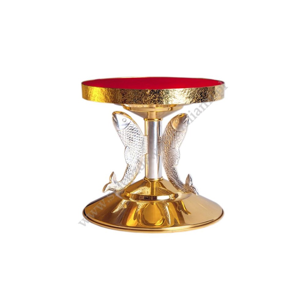 Tron pod monstrancję z motywem ryb o wysokości 28 cm, średnicy tronu 25 cm i średnicy podstawy 26 cm.