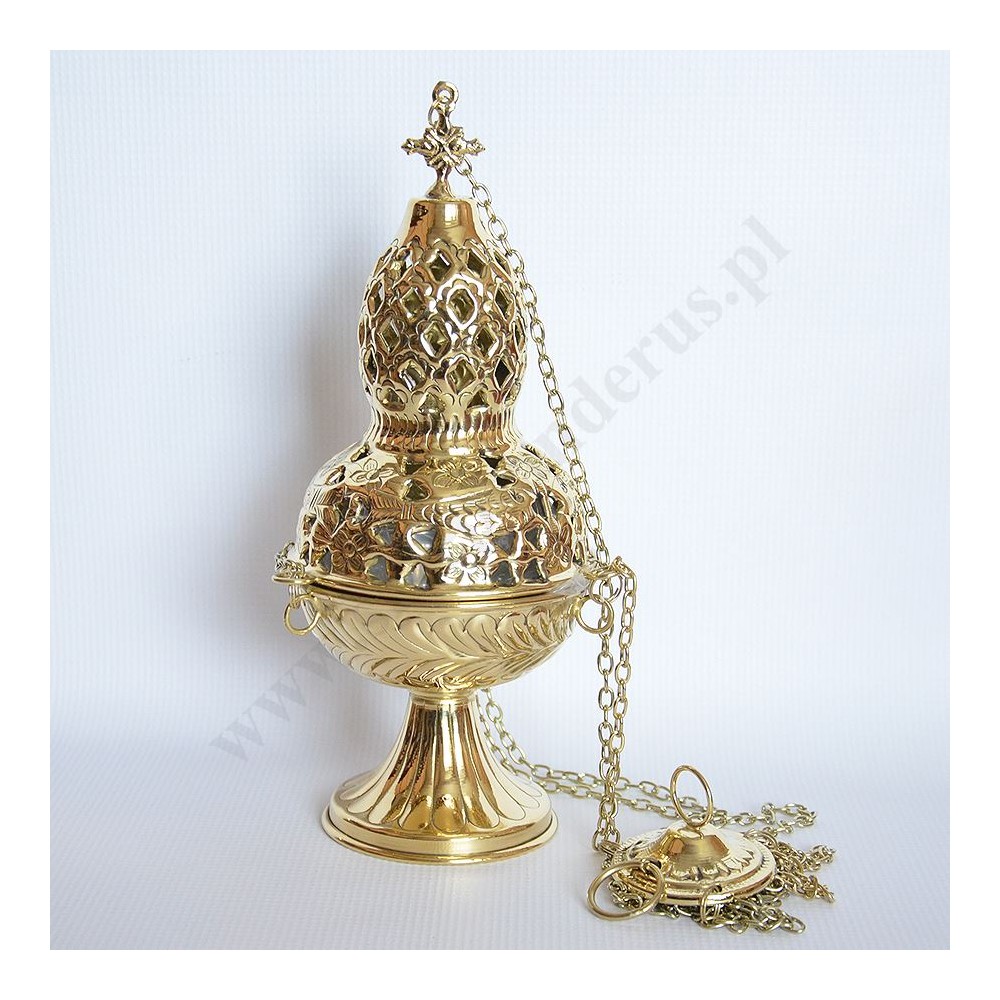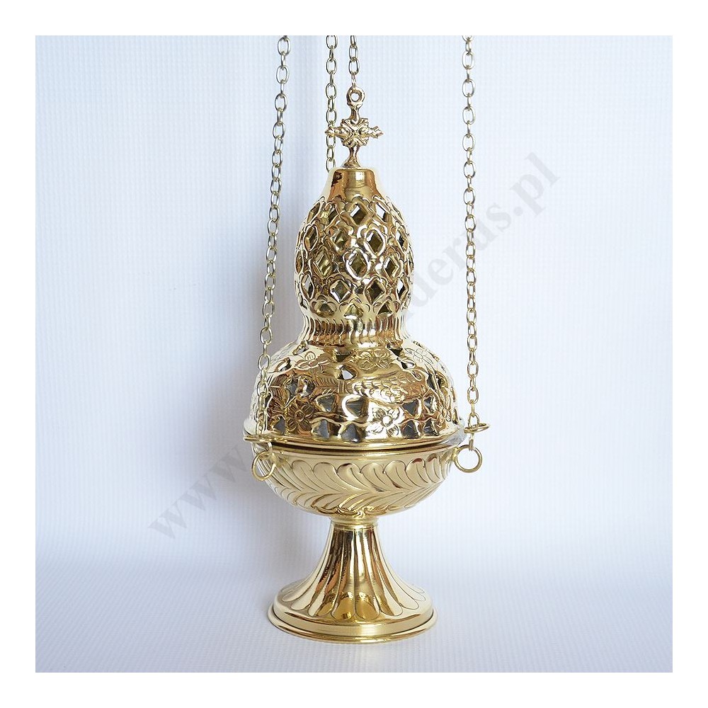 Trybularz wykonany z blachy mosiężnej w komplecie z wkładem. Wysokość relikwiarza 27 cm, średnica 11 cm.