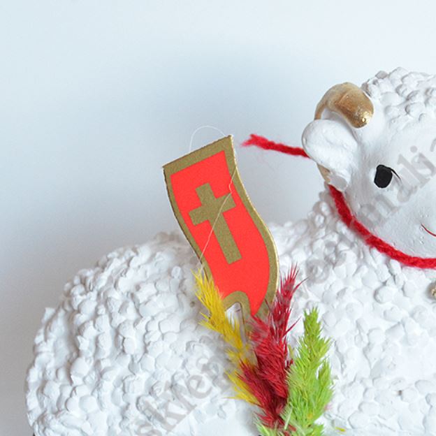 Baranek wielkanocny gipsowy o wysokości 8.5 cm i szerokości 10.5 cm.