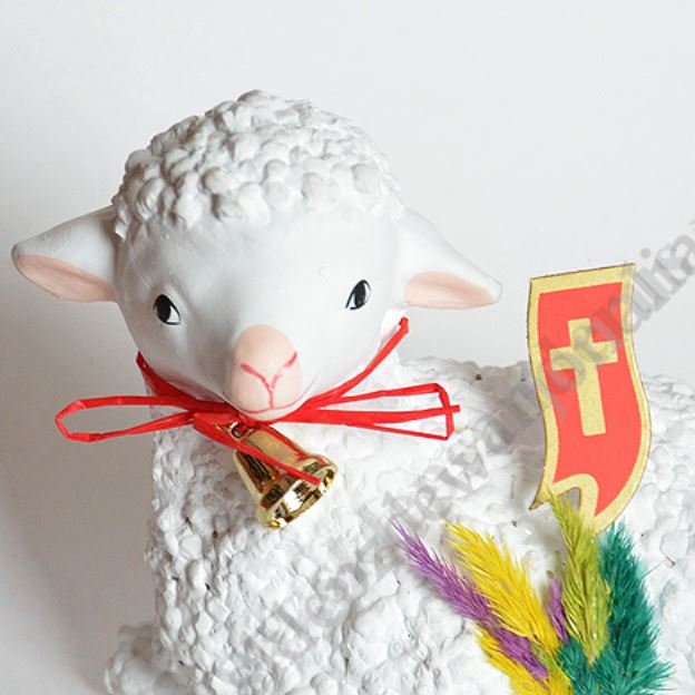 Baranek wielkanocny wykonany z gipsu o wysokości 9.8 cm i szerokości 13 cm.