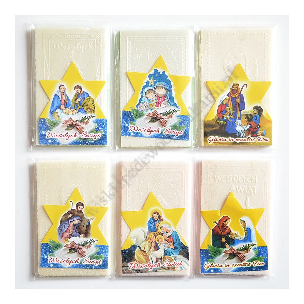 Komplet opłatków wigilijnych składający się z trzech małych opłatków oraz jednego małego kolorowego (dla zwierząt), format opłatków 6 x 10 cm, pakowanych w folijce z kolorowym obrazkiem bożonarodzeniowym.
