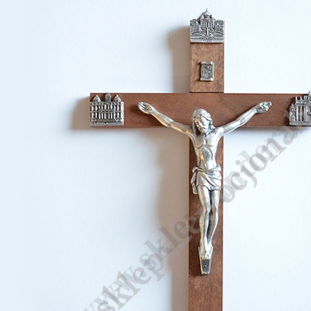 Krzyż drewniany o wysokości 30 cm z metalowym korpusem Pana Jezusa oraz z metalowymi wizerunkami najważniejszych bazylik na świecie.