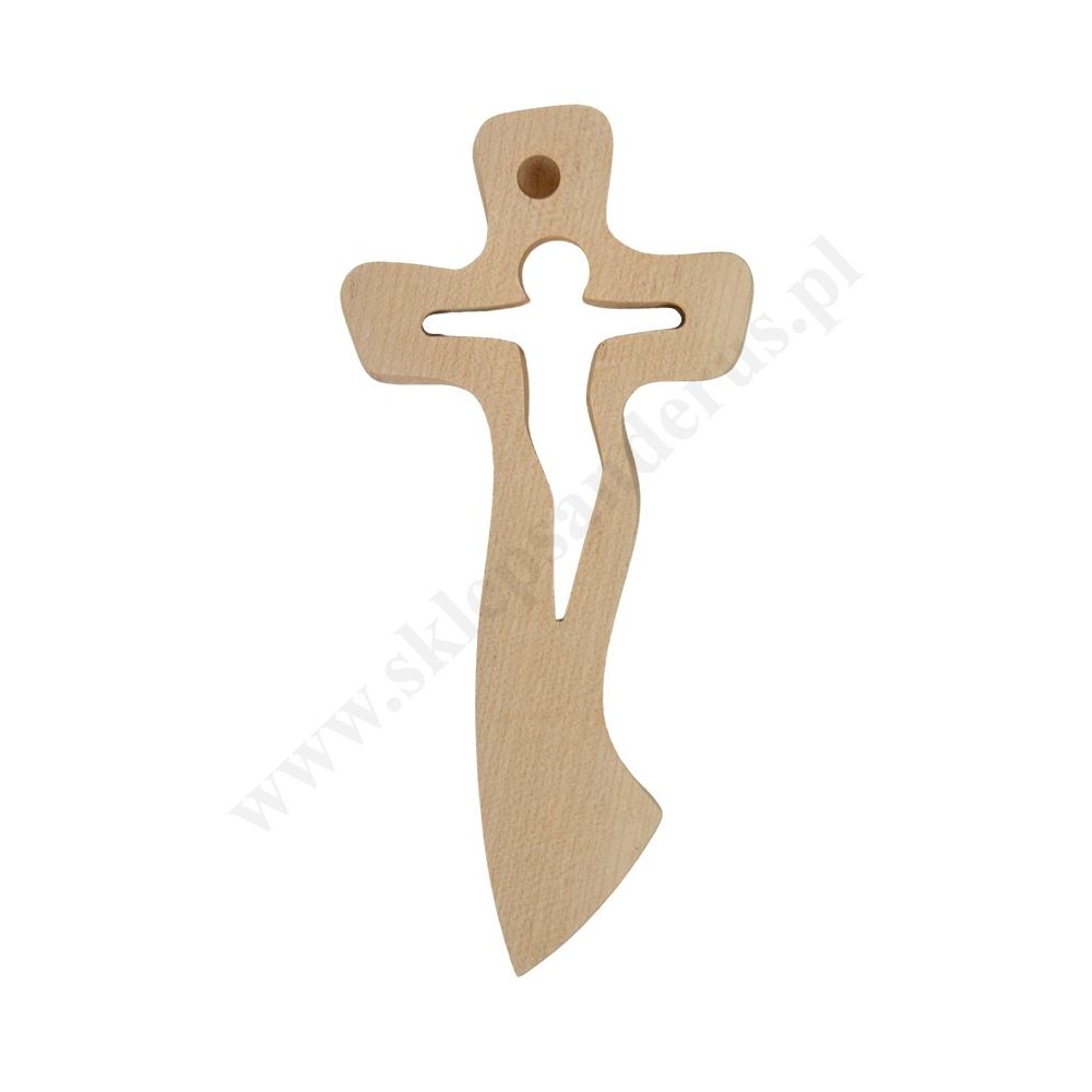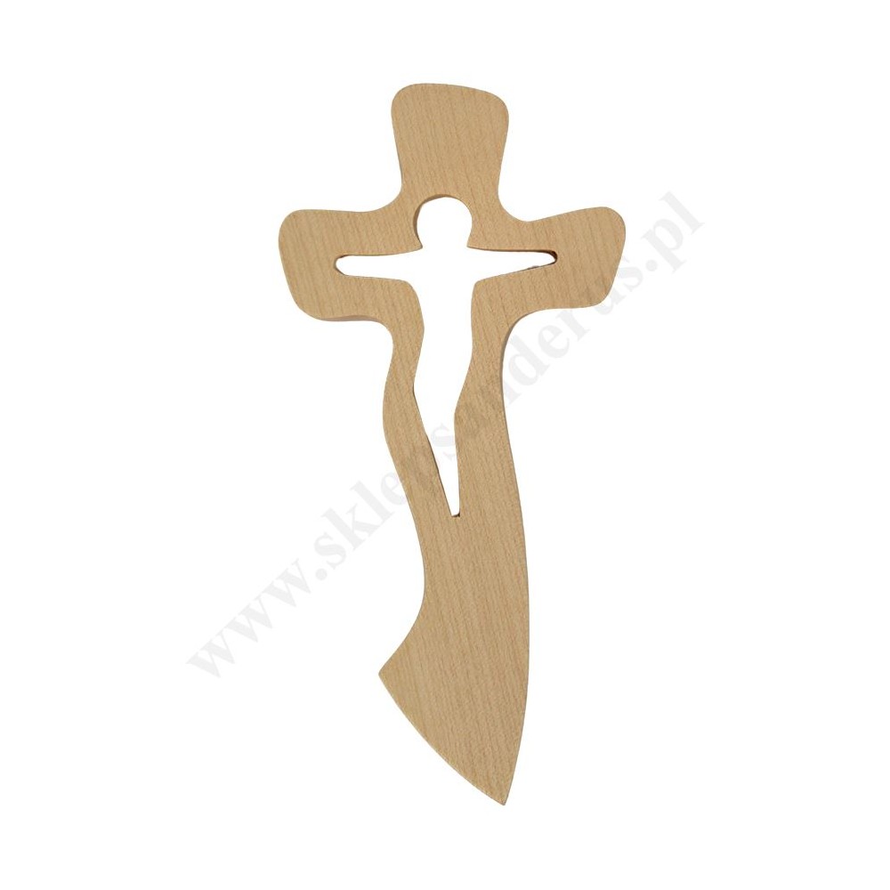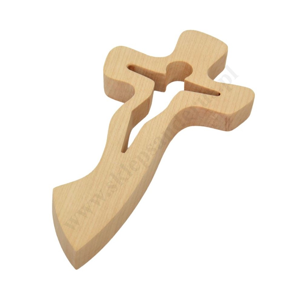 Krzyż drewniany, rękodzieło o wysokości ok. 19.7 cm, szerokości ok. 9.3 cm i grubości ok. 1.5 cm. UWAGA: Z racji, że krzyżyk jest wykonywany ręcznie może się delikatnie różnić wymiarami i kolorem.