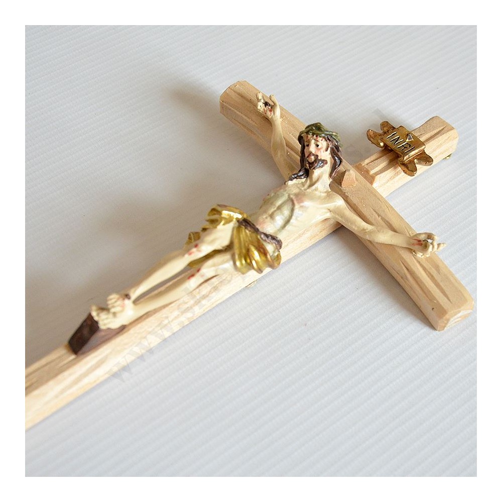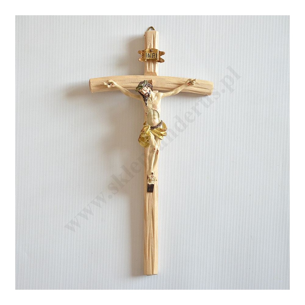 Krzyż wiszący na ścianę o wysokości 25 cm i szerokości 12.5 cm z postacią Pana Jezusa wykonaną z tworzywa sztucznego o wysokości 11.5 cm i szerokości 9 cm.