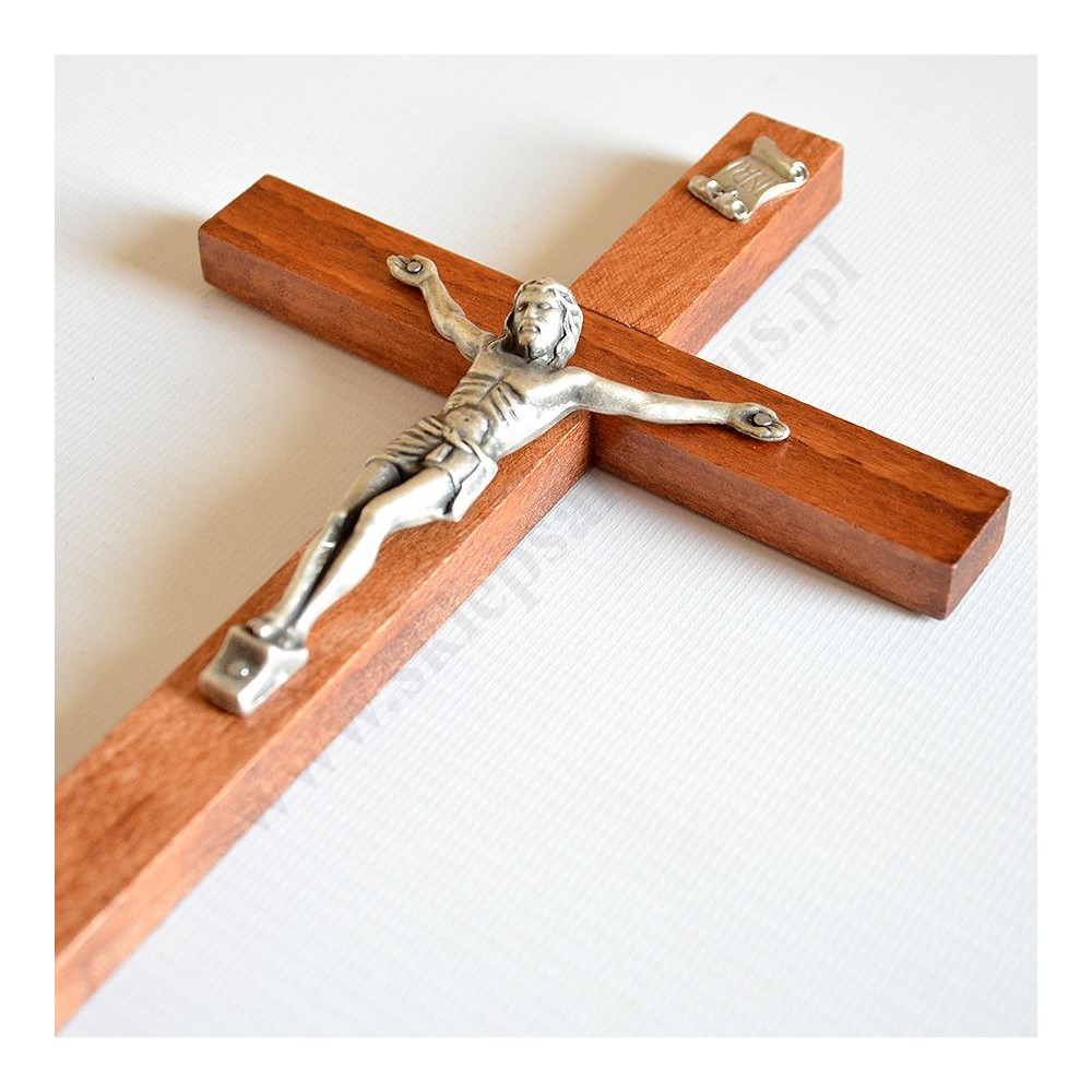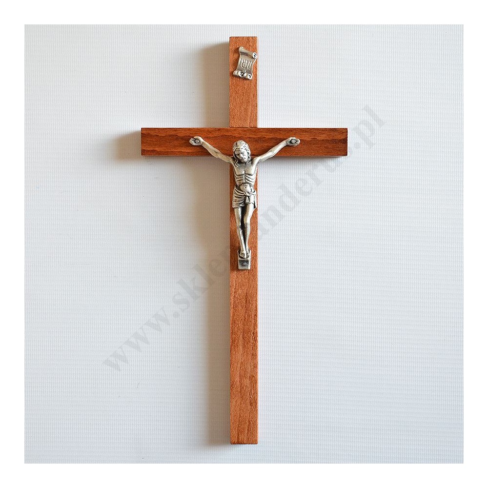 Krzyż drewniany o wysokości 27 cm i szerokości 13.5 cm z metalowym korpusem Pana Jezusa o wysokości 9 cm.