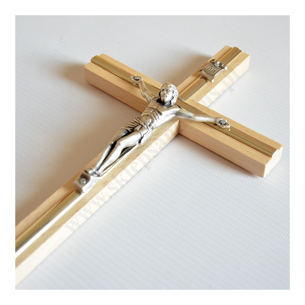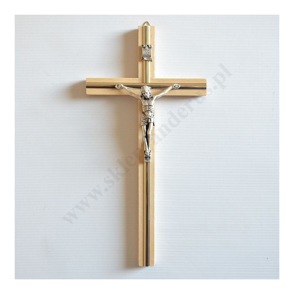 Krzyż drewniany z metalową wstawką o wysokości 27 cm i szerokości 13.5 cm z metalowym korpusem Pana Jezusa o wysokości 9 cm.