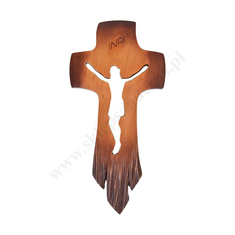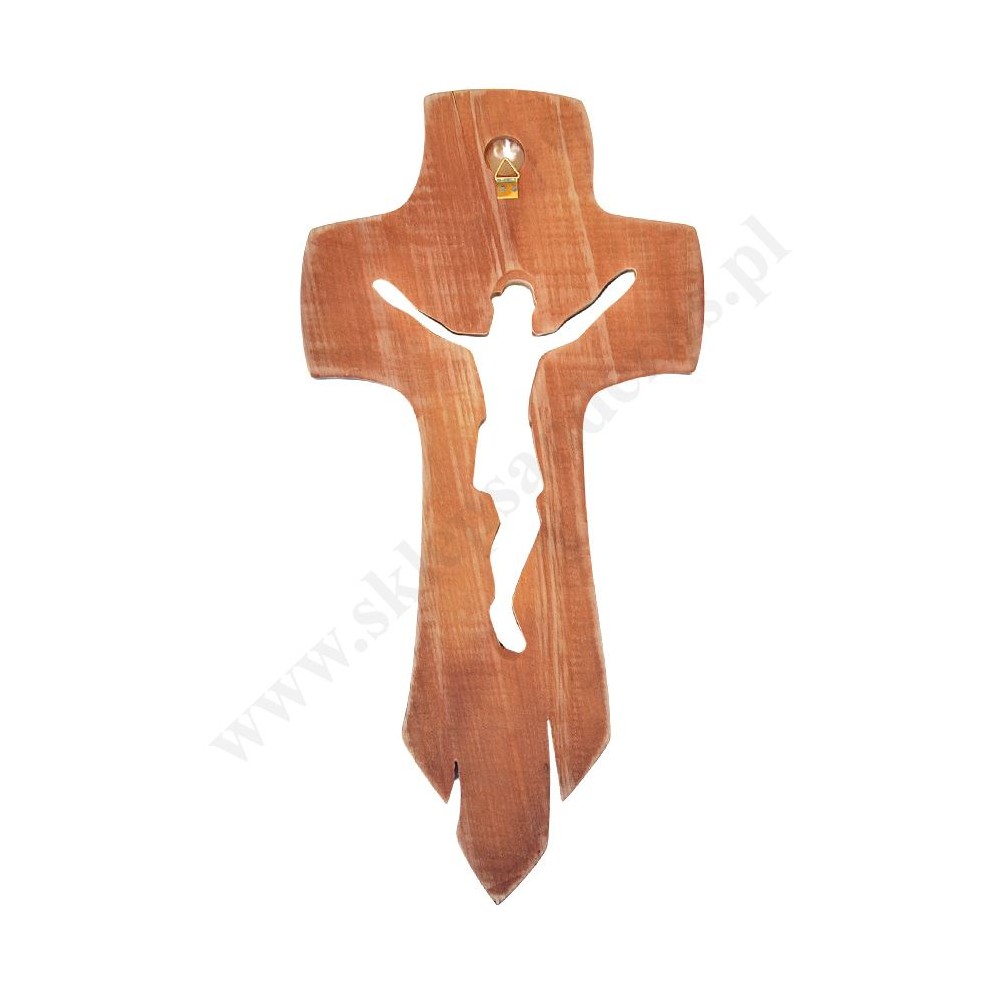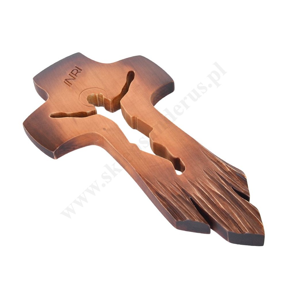 Krzyż drewniany, rękodzieło o wysokości 39.6 cm, szerokości 19.8 cm i grubości 2.4 cm. UWAGA: Z racji, że krzyżyk jest wykonywany ręcznie może się delikatnie różnić wymiarami i kolorem.
