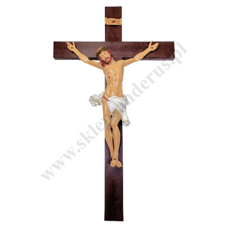 Krzyż wykonany z drewna o wysokości 96 cm i szerokości 55 cm, bejcowany farbą w kolorze mahoniowym. Pasyjka z masy żywicznej.