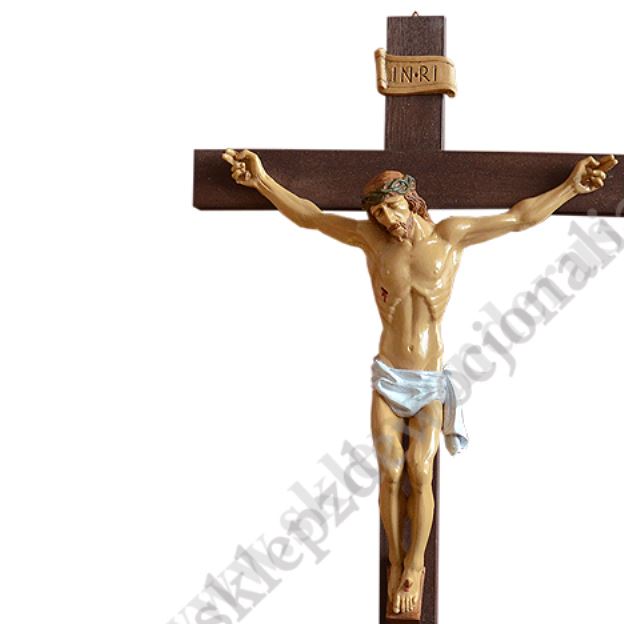 Krzyż drewniany o wysokości 54 cm z postacią Pana Jezusa wykonana z tworzywa sztucznego.