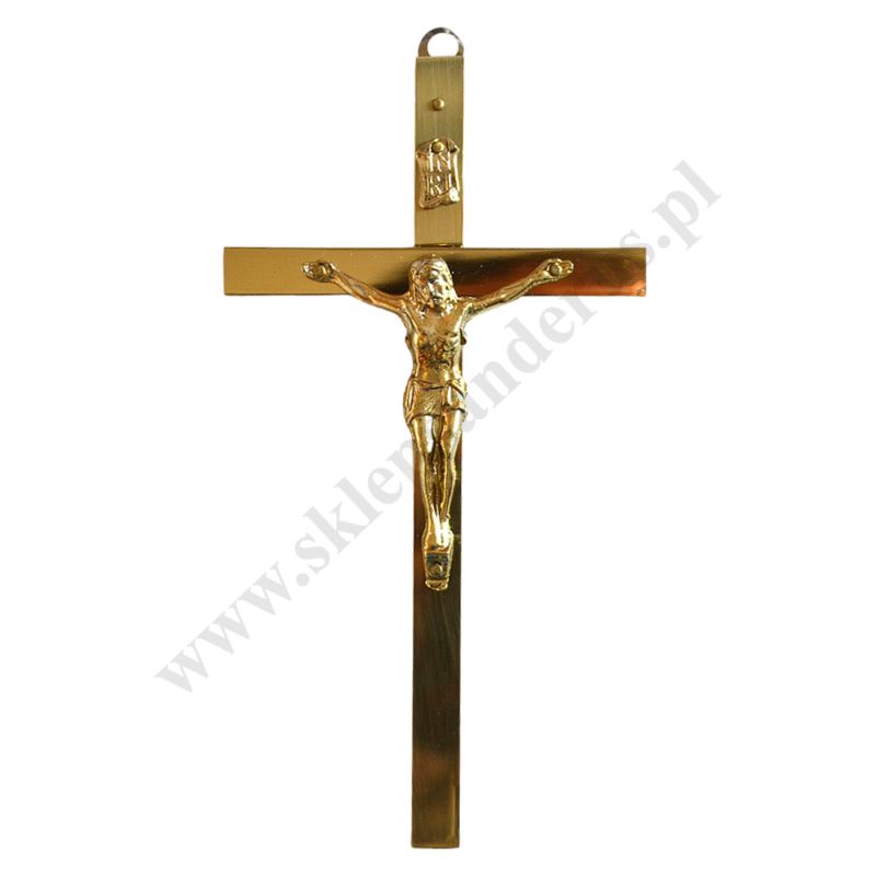Krzyż metalowy mosiężny z metalowym korpusem Pana Jezusa. Krzyż o wysokości 16 cm i szerokość ramion 8.5 cm.